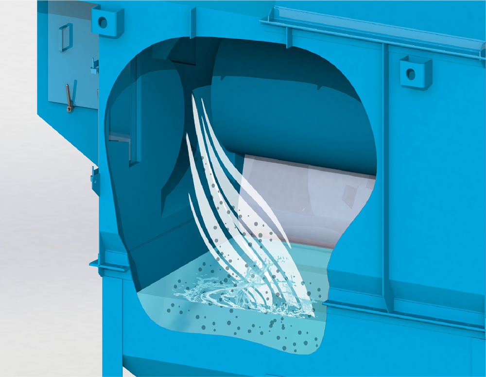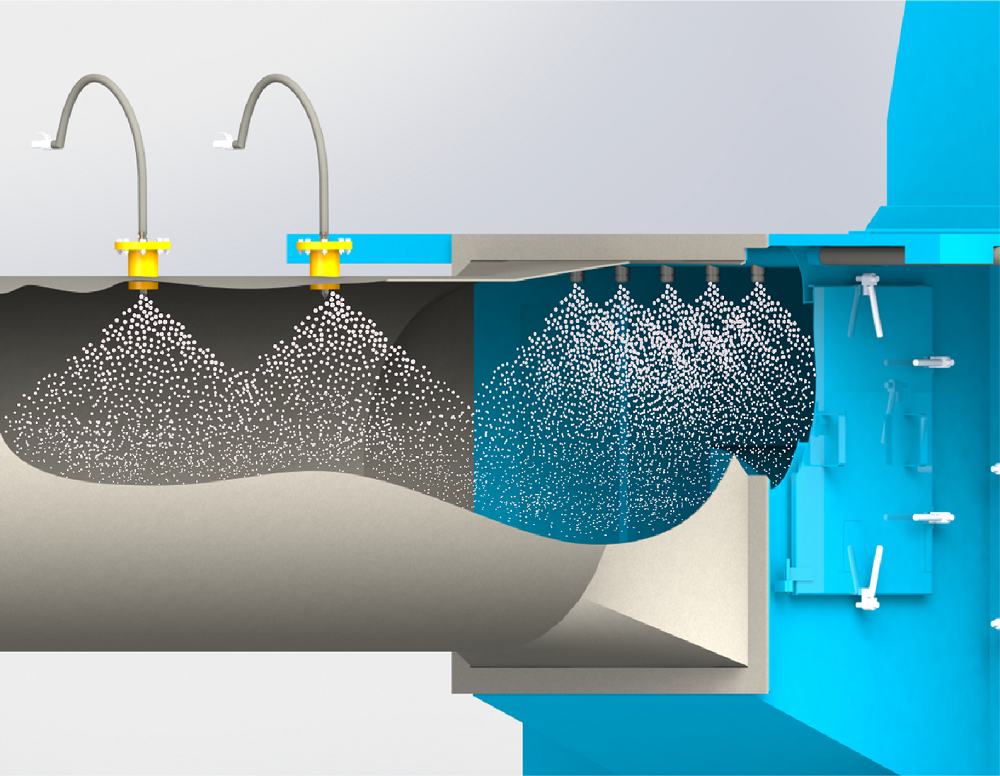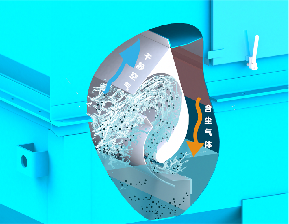 經過離心分離室離心處理的空氣進入到洗滌室,此時空氣中的絕大部分粉塵顆粒都已經被處理掉。洗滌室有一個精心設計的漩渦狀風道,空氣進入漩渦狀通道后,運動方向會產生劇烈改變,從而在液面上激起無數的水花和霧滴,極少量未處理掉的粉塵顆粒,在通過這些水花和霧滴時,又進一步被洗滌和吸附,含塵空氣被凈化干凈。凈化干凈的空氣由此從除塵工藝轉向脫水工藝。