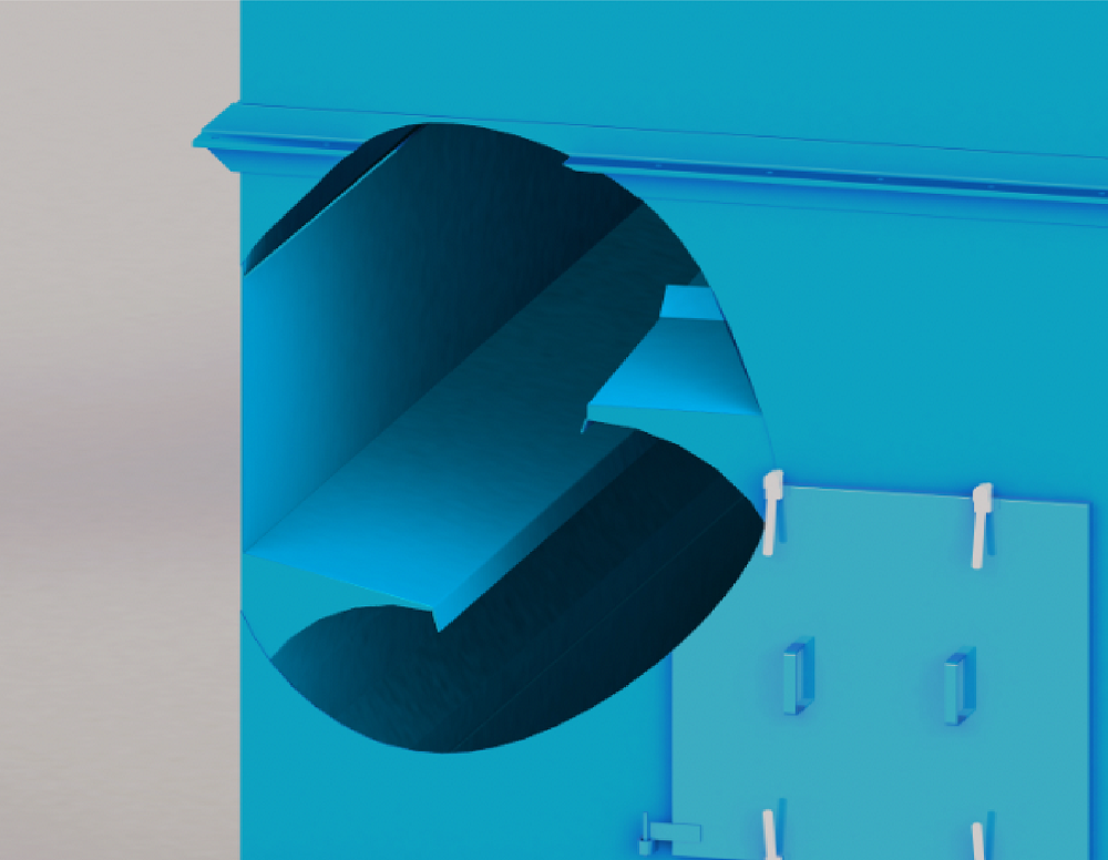含塵空氣經過噴淋室和沖擊室后,充分地和液滴進行了碰撞和接觸,未處理掉的粉塵顆粒已經被液滴浸潤和包覆,質量和體積都會數倍增加,慣性增大,粉塵顆粒在氣流中的運動軌跡也變得光滑且有規律。離心分離室內設有我們通過fluent流體仿真軟件專利設計的S型離心風道,含塵空氣進入S型離心風道后,流速會突然下降,干凈空氣會在離心風機的作用下繼續向前流動,而粉塵顆粒因為慣性和離心力的作用下隨著彎道向下進入箱體底部,最終沉積到排泥錐斗中。絕大多數的粉塵顆粒會在此過程中被處理掉。